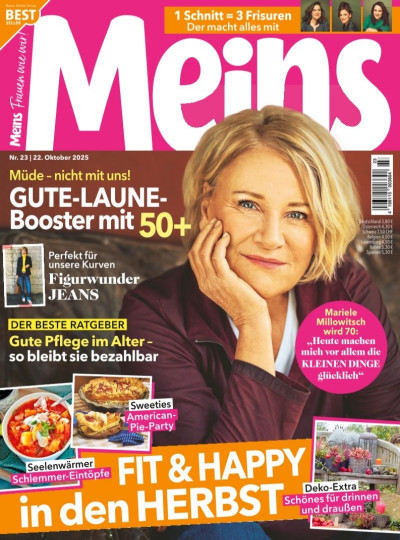 Wollen Sie sich selbst etwas Gutes tun oder einer Freundin die etwas andere Zeitschrift schenken? Dann ist "Meins" genau das Richtige. Einfach als Abo selber bestellen oder verschenken. Sie finden darin aktuelle Themen zu Gesundheit, Kosmetik, Mode, Beziehungen, Geschichten über ganz "normale" Frauen, aber auch saisonale Rezepte, Tipps und Lebensweisheiten. Speziell für Frauen 50plus, die den Alltag genießen wollen und für Neues aufgeschlossen sind. Das Herzstück laut Verlag ist die Café Meins Community. Sie bietet Veranstaltungen, Möglichkeiten zu Treffen und die Vorteilswelt mit Gewinnspielen, Rabatten und Gutscheinen an. Lassen Sie sich von dieser Frauen-Power inspirieren und bestellen Sie "Meins" mit Lieferung frei Haus direkt in den Briefkasten. So sind Sie stets als Erste über die aktuellen Themen für einen aktiven Lebensstil informiert.